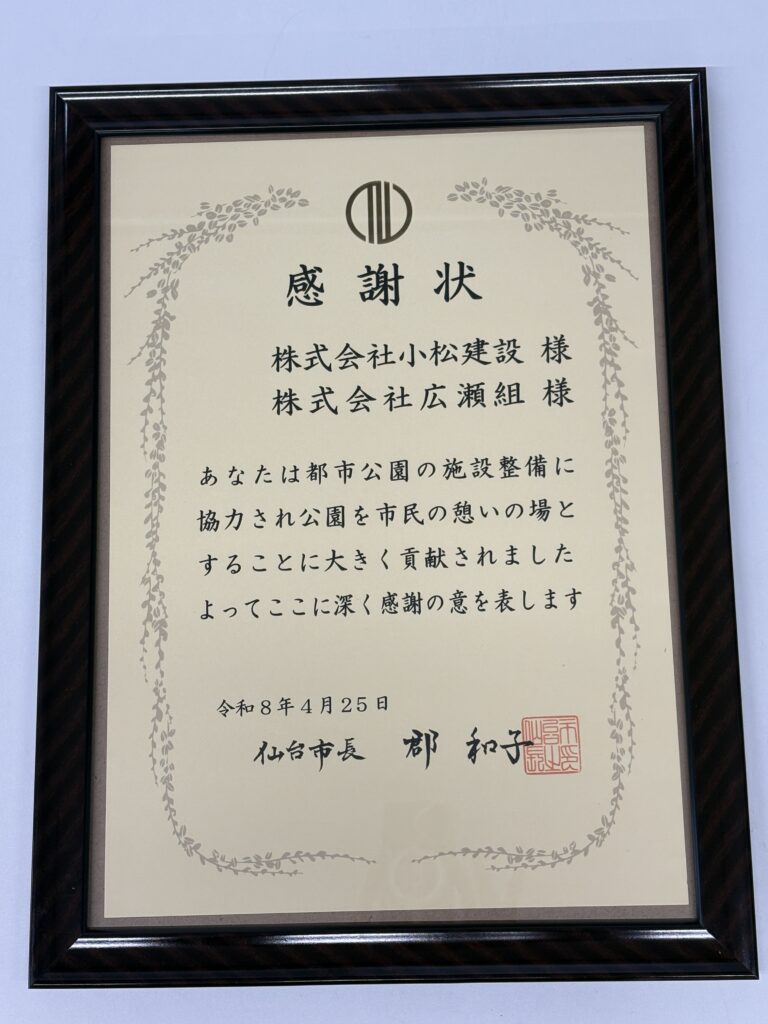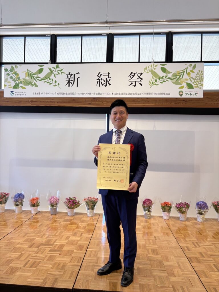 令和8年度 新緑祭緑化功労者(公園施設寄付部門)にて仙台市長より表彰をいただきました。